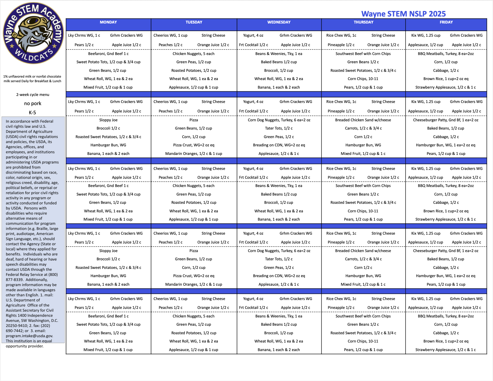 Wayne STEM Academy will be participating in the National School Lunch Program (NSLP) to provide healthy breakfast and lunch options for scholars.